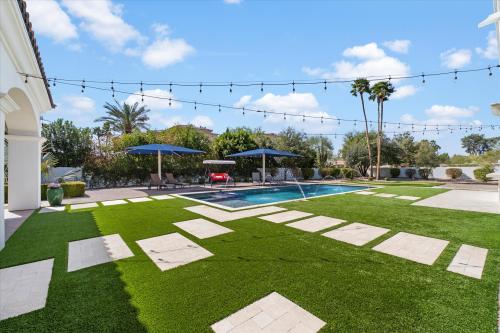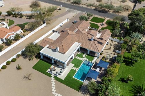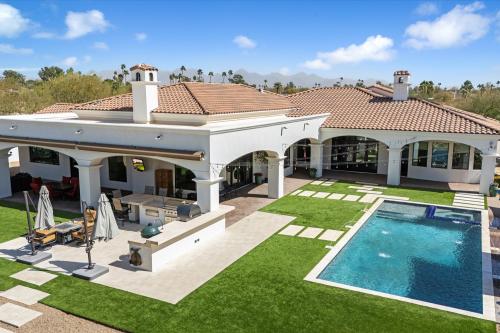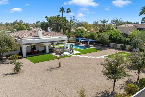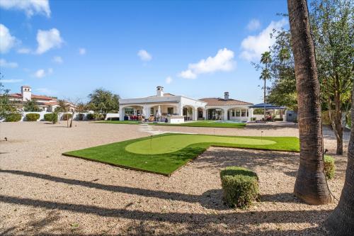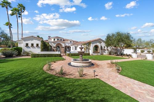 Experience grandeur in this 5,561 sq. ft. Mediterranean estate, a rare find in Paradise Valley's Country Club Acres and the prestigious 3 C's Scottsdale School District. Move-in ready and designed to impress, this 5-bed, 4.5-bath home features soaring 14-16 ft. ceilings, expansive windows, hand-laid wide plank flooring, limestone fireplaces, and designer finishes. The primary suite offers his-and-hers closets and a spa-inspired ensuite with dual vanities, a soaking tub, and a spa shower. The chef's kitchen boasts two islands, Wolf/Sub-Zero appliances, a butler's pantry, and a wine fridge. Set on 52,932 sq. ft., enjoy a resort-style pool, heated spa, patios, pickleball court space, and a putting green. A 4-car garage with an EV charger completes this luxury home.