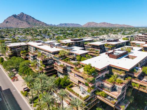 Optima Camelview. Private Corner Luxury • Walk to Fashion Square, Cocktails & Dining. Perfectly timed for buyers in town, this fully remodeled private corner residence offers rare walkable Scottsdale living—just steps from Fashion Square, Caesars Republic, and Old Town. Unlike many urban condos, this home delivers exceptional privacy with no neighboring units looking in—never a fishbowl. Floor-to-ceiling windows capture Pinnacle Peak views and fill the space with natural light. The 2-bed, 2-bath residence spans 1,549 sq ft with two patios, a wine fridge, and a new remodel. Includes two secured garage parking spaces. Condo features concierge and security, fitness center, indoor & outdoor pools, spa, sauna, sport courts, and dog park—all in the heart of Scottsdale. Come Say Yes!