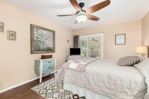 This beautifully updated 2-bedroom, 2-bath townhome offers 1,409 sq. ft. of thoughtfully designed living space, ideal for an active yet relaxed lifestyle. Well-maintained home shows pride of ownership with $65,000+ in improvements!! Remodeled kitchen, engineered hardwood flooring, custom tile, Corian countertops, refaced cabinetry, custom backsplash and upgraded appliances. Additional upgrades include a 2023 water heater with recirculation pump, replaced main sewer line house to street (2025), updated windows, remodeled primary bathroom w walk in shower, updated guest bath, screened AZ room, cobblestone courtyard and upgraded closet design. Large screened-in back patio and large cobblestone front courtyard with private gate. Eat-in kitchen, dining space and spacious living room provide comfortable spaces for both everyday living and entertaining guests. Living room with 3 panel glass doors opens to a private, peaceful backyard patio perfect for morning coffee or unwinding in the evenings.