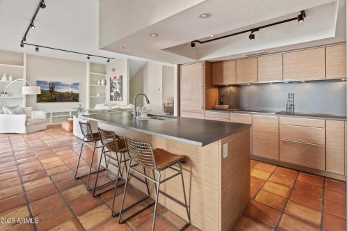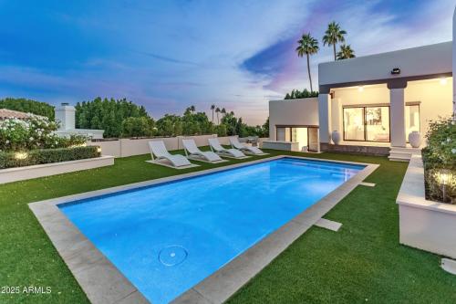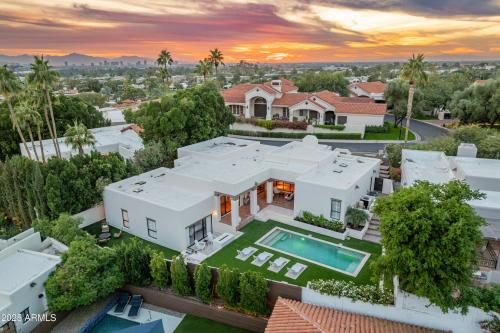 The perfect blend of Modern Desert Living and Traditional Southwest Territorial Design, this exceptional home sits in the highly coveted guard-gated Biltmore Greens community. Enjoy breathtaking views of the Praying Monk, Camelback Mountain, and the Phoenix Mountain Preserve from nearly every room, enhanced by large windows and multiple glass sliding doors that bring the outdoors in. The split floor plan offers a fun, comfortable flow with soaring ceilings, striking wood-beam accents, and inviting spaces to unwind. The contemporary chef's kitchen features Poggenpohl cabinetry, honed granite countertops, and premium Miele appliances — a flawless balance of style and performance. Several rooms open directly to a newly reimagined private desert retreat, where a stunning resort-style pool, built-in grill, outdoor fireplace, lush turf, and multiple entertaining areas await - all perfectly oriented to capture the serene, scenic mountain backdrop. More than a home, this property embodies the Biltmore lifestyle - iconic, timeless, and undeniably Arizona.